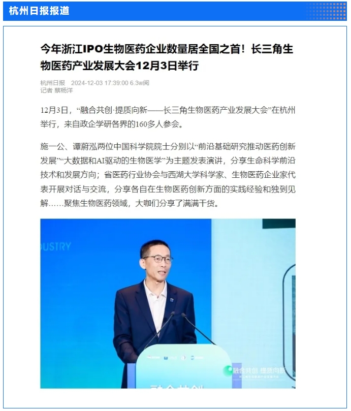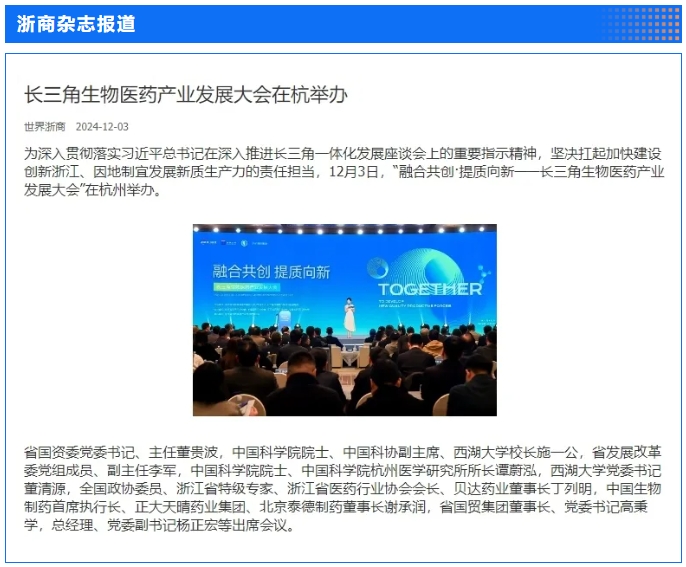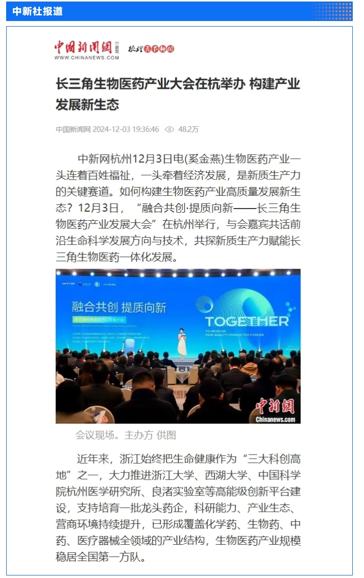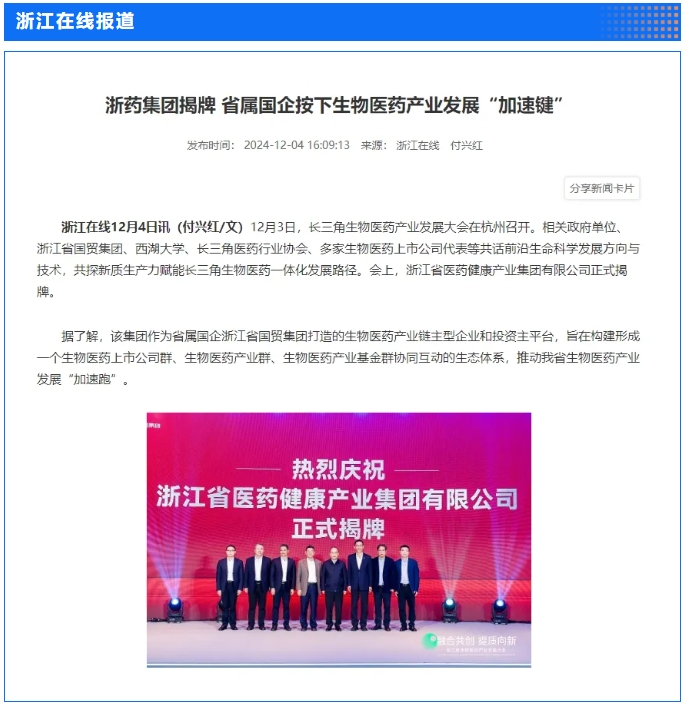 12月3日,省國貿集團和西湖大學主辦,集團下屬浙藥集團承辦的“融合共創·提質向新——長三角生物醫藥產業發展大會”在杭州圓滿舉行,會上,行業專家和企業家聚焦前沿生命科學的發展趨勢與技術革新,共同探討如何構建長三角生物醫藥一體化發展新格局。浙江日報專版深度聚焦會議情況,中新社、央視網、證券時報、浙江在線、浙江國資、浙商雜志、杭州日報等多家媒體對會議進行了報道。